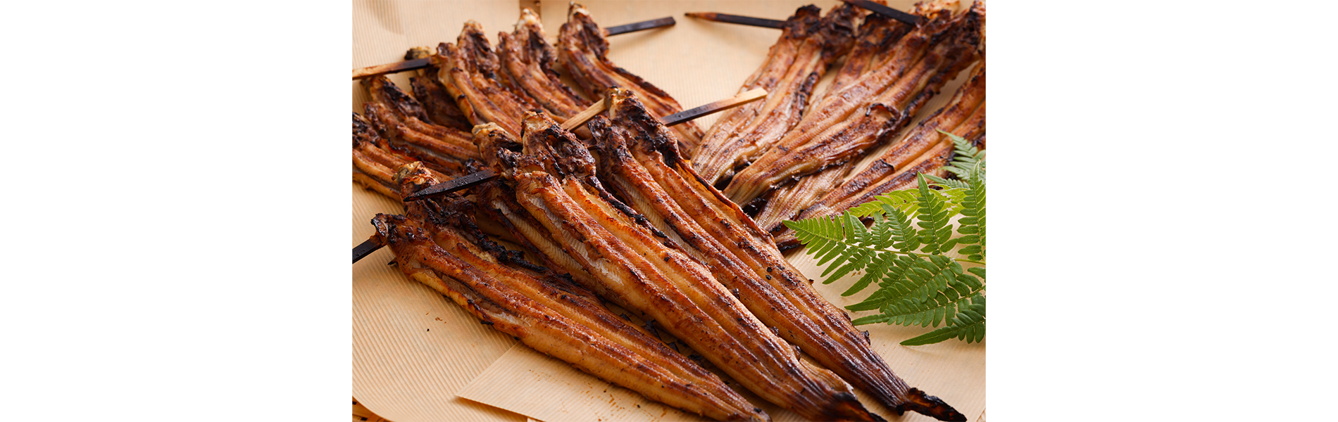厳選した天然活穴子のみを使用し、毎朝水槽から当日使用する分を氷〆し、一匹一匹ていねいに開き、串打ちをし、炭火で焼き上げるという